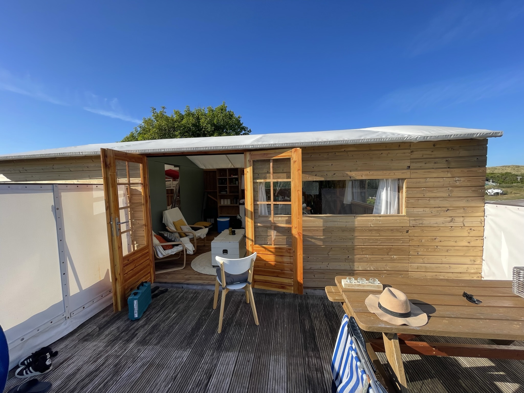 Een unieke ervaring. Het comfort van een huisje, maar wel midden op de camping en vlak bij het strand.